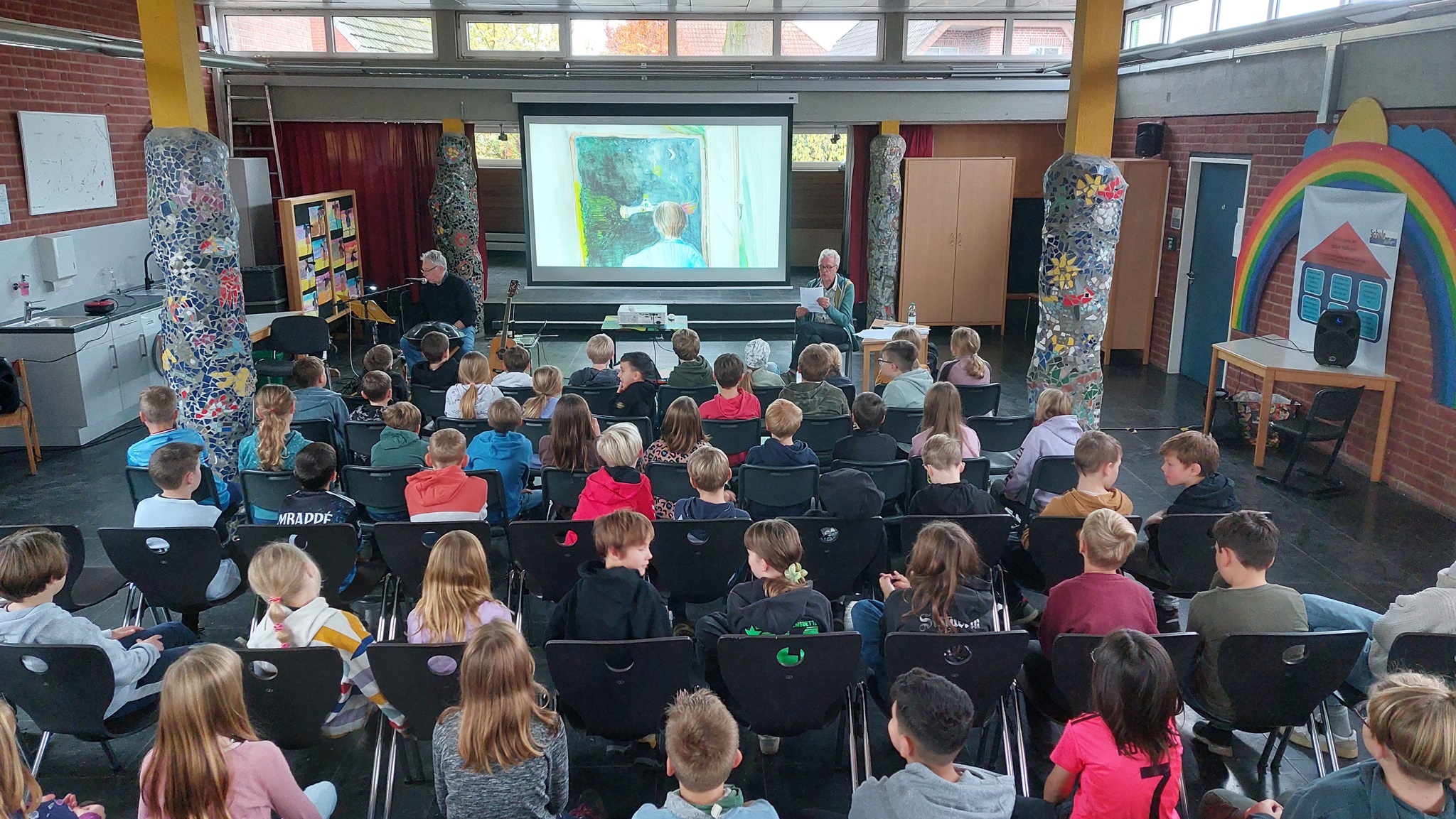 Eine multimediale Lesung für die dritten und vierten Jahrgänge gab es von Rudolf Gier-Seibert. Er stellte sein neues Kinderbuch „Die Stimme aus dem Koffer“ vor. Musikalisch begleitet wurde er dabei von Michael Kofort mit Handpan, Gitarre und anderen Instrumenten. Außerdem wurden per Beamer die Buchillustrationen auf die Leinwand projiziert.